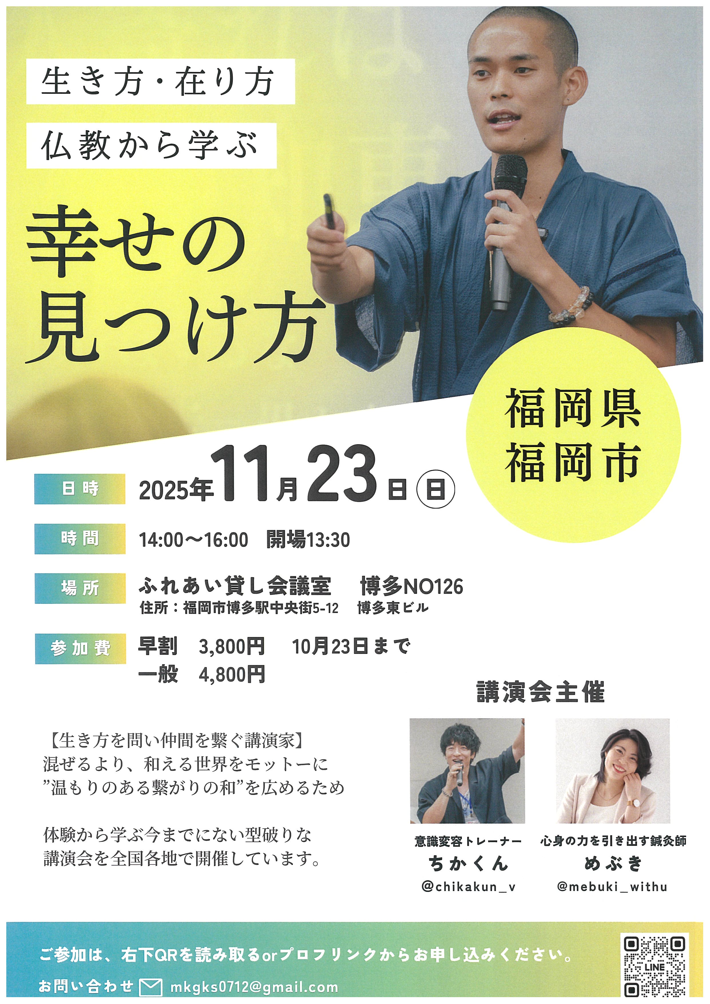 【生き方を問い中間を繋ぐ講演家】 混ぜるより、和える世界をモットーに”温もりのある繋がりの和”を広めるため 体験から学ぶ今までにない型破りな講演会を全国各地で開催しています。 ■時間 14:00~16:00 ■場所 福岡市博多駅中央街5-12 博多東ビル ふれあい貸し会議室 博多NO126 ■お問い合わせ先 mkgks0712@gmail.com