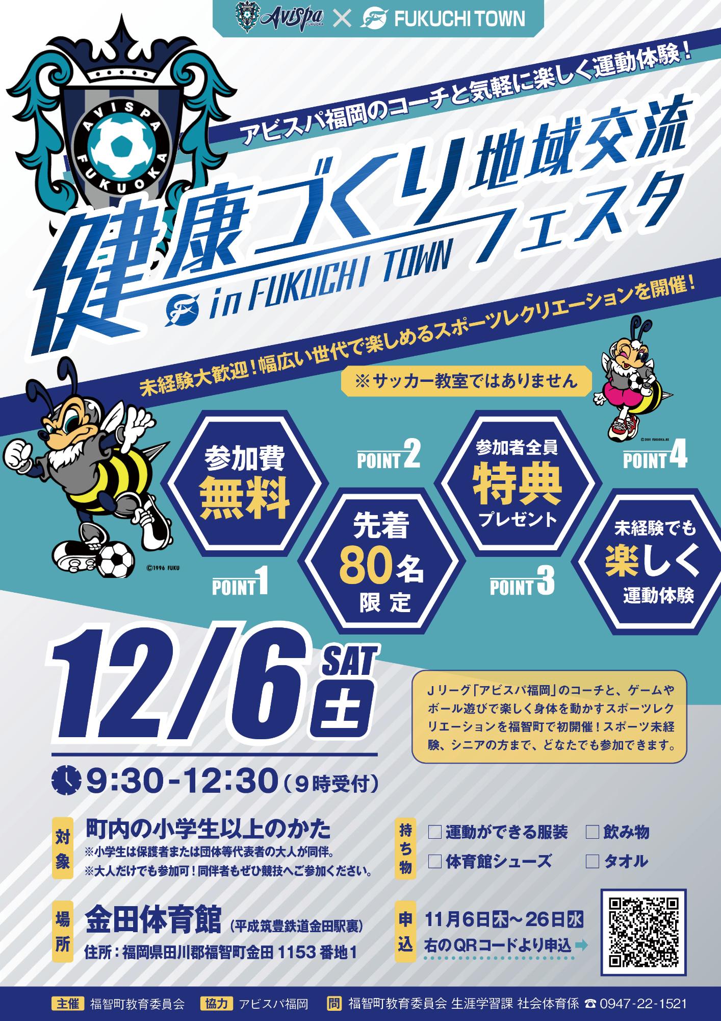 Jリーグ「アビスパ福岡」のコーチと一緒にゲームやボール遊びで身体を動かすスポーツレクリエーションを福智町で初開催!スポーツ未経験者でも楽しく参加できます!運動会形式で競技の合計点をチームで競い、優勝チームにはアビスパグッズを進呈します!小学生からシニアの方まで幅広い世代で楽しめるスポーツイベントですので、奮ってご参加ください。